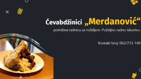 Ćevabdžinici “Merdanović” u Zenici potrebna radnica za roštiljem. Poželjno radno iskustvo. Za više informacija se javiti u objekat...