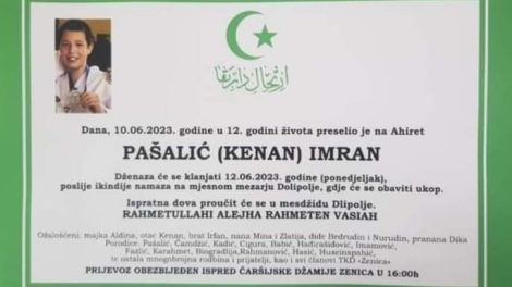 Dženaza 12-godišnjem Imranu Pašaliću, koji je poginuo jučer u saobraćajnoj nesreći kod Novog Travnika, biće klanjana sutra u Zenici, na mjesnom...