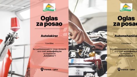 Oglas za posao: Autolakirer i automehaničar- Almy d.o.o. Zenica objavljuje konkurs za prijem u radni odnos: POZICIJA: Autolakirer LOKACIJA: Vranduk...