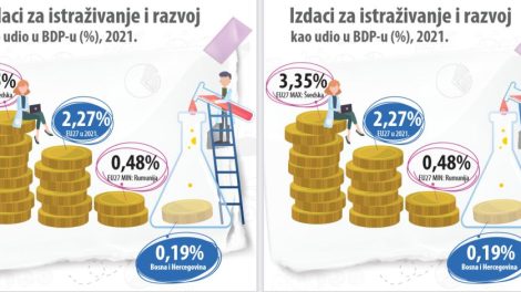Bosna i Hercegovina je sa ulaganjem od 0,19% BDP-a u istraživanje i razvoj u 2021. godini bila daleko ispod prosjeka 27 zemalja EU koji iznosi 2,27%...