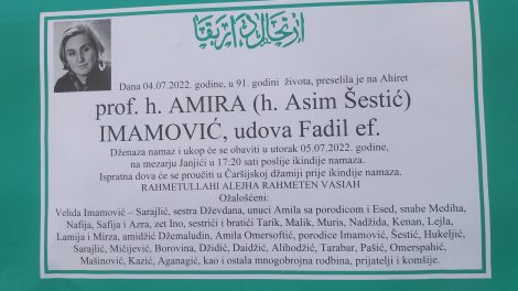 KADA ODU DRAGI LJUDI h. AMIRA IMAMOVIĆ, prof. (1931.2022.) Jučer je u Zenici klanjana dženaza h. Amiri Imamović, dugogodišnjoj profesorici u Prvoj...