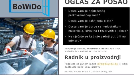 Kompanija BoWiDo d.o.o. je osnovana 2021. godine i izvozno je orjentisano. Cjelokupnu proizvodnju stolarije plasiramo na tržište EU. Našakompanija...