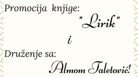 Promocija knjige “Lirik” petak u 18:30h- Dugo očekivana promocija knjige „Lirik“ i druženje sa Almom Taletović će se održati u 20.8. 2021...