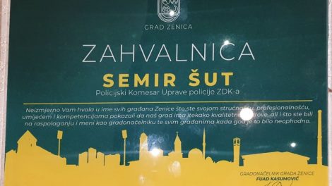 Policijskom komesaru Semiru Šutu uručena zahvalnica Grada Zenica- Policijskom komesaru Uprave policije Ministarstva unutrašnjih poslova Zeničko...