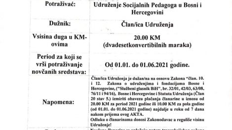 Udruženje Socijalnih pedagoga BiH: molba za uplatu članarina- Poštovani, usljed nagomilanih dugovanja prema Gradu Zenica, Poreznoj Upravi FBiH...