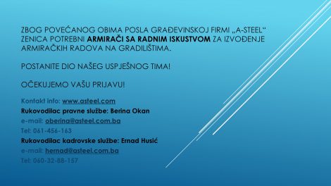 Oglas za posao: armirači sa radnim iskustvom- Zbog povećanog obima posla građevinskoj firmi “A-Steel” Zenica potrebni armirači sa radnim...