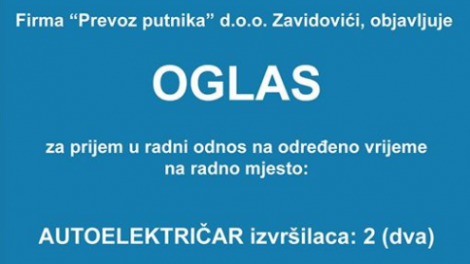 Oglas za posao: potrebni autoelektričari – Firma “Prevoz putnika” d.o.o. Zavidovići, objavljuje Oglas za prijem u radni odnos na određeno...