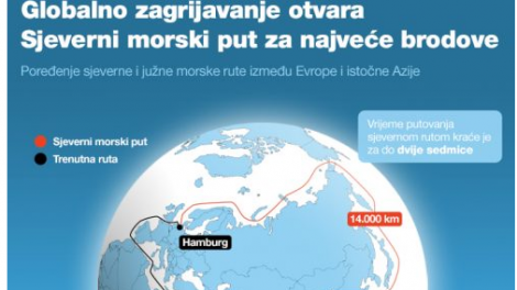 Infografika: Globalno zagrijavanje otvara Sjeverni morski put – Plovidba sjevernom pomorskom rutom kraća je za do dvije sedmice i šest hiljada...
