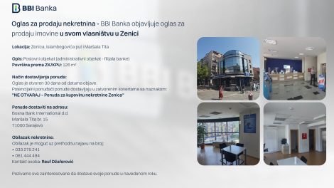 Oglas za prodaju nekretnina u vlasništvu banke u Zenici- Bosna Banka oglašava prodaju poslovnih objekata u Vitezu, Ilidži i Zenici. U ponudi su...
