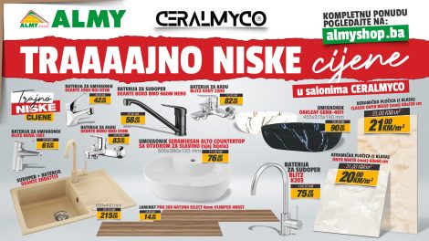 Trajno niske cijene u salonima CERALMYCO! Izdvajamo: – granitni sudoper DEANTE sa baterijom – snižen sa 297 na 215 KM, – keramičke...
