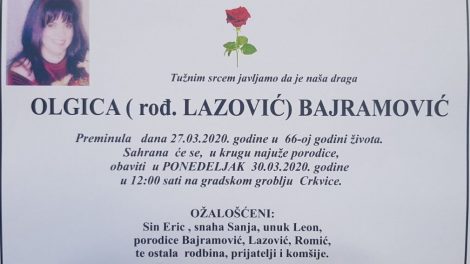 Zauvijek nas je napustila naša sugrađanka Olgica Bajramović (rođ.Lazović). Preminula je u 66.godini, nakon duge borbe sa opakom bolešću. Njena...