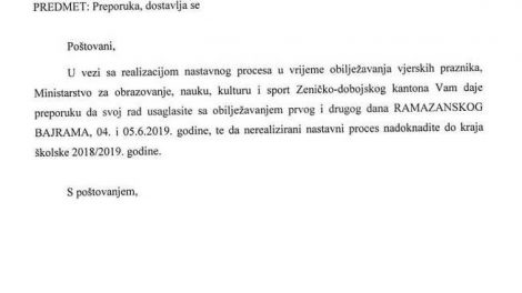 Školama u ZDK preporučeno da rad usklade sa obilježavanjem prvog i drugog dana Bajrama Ministarstvo za obrazovanje, nauku, kulturu i sport Zeničko...