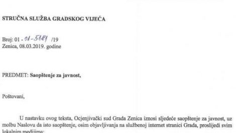 OCJENJIVAČKI SUD GRADA ZENICA STRUČNA SLUŽBA GRADSKOG VIJEĆA Broj: 01 – tJI -S1RI 119 Zenica, 08.03.2019. godine PREDMET: Saopštenje za...