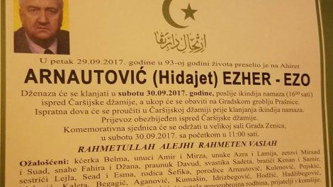 Umro Ezher Ezo Arnautović, komemoracija u Velikoj sali Grada Zenica u subotu u 11 sati – Prijeratni predsjednik Skupštine Opštine Zenica, u...