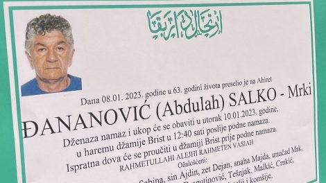 Dženaza namaz Salki (Abdulaha) Džananoviću i ukop obaviće se sutra (utorak) 10. januara, u haremu džamije Brist, u 12.40 sati, poslije Podne namaza...