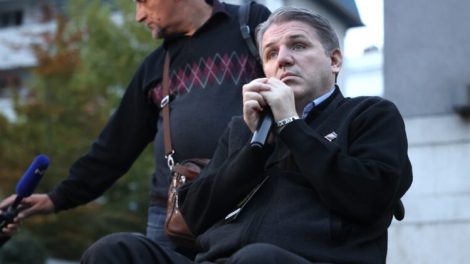 Mujo Aganović, predsjednik RVI paraplegičara Federacije BiH, koji je bio jedan od govornika na protestima protiv odluka visokog predstavnika ispred...