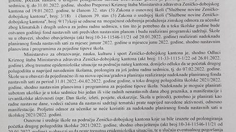 Ministarstvo obrazovanja, nauke, kulture i sporta Zeničko-dobojskog kantona tokom dana će svim osnovnim i srednjim školama uputiti...