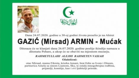 Našem sugrađaninu Arminu Gaziću danas će biti klanjana dženaza u njegovoj rodnoj Zenici, u džematu Pehare poslije ikindije namaza. Bit će ukopan na...
