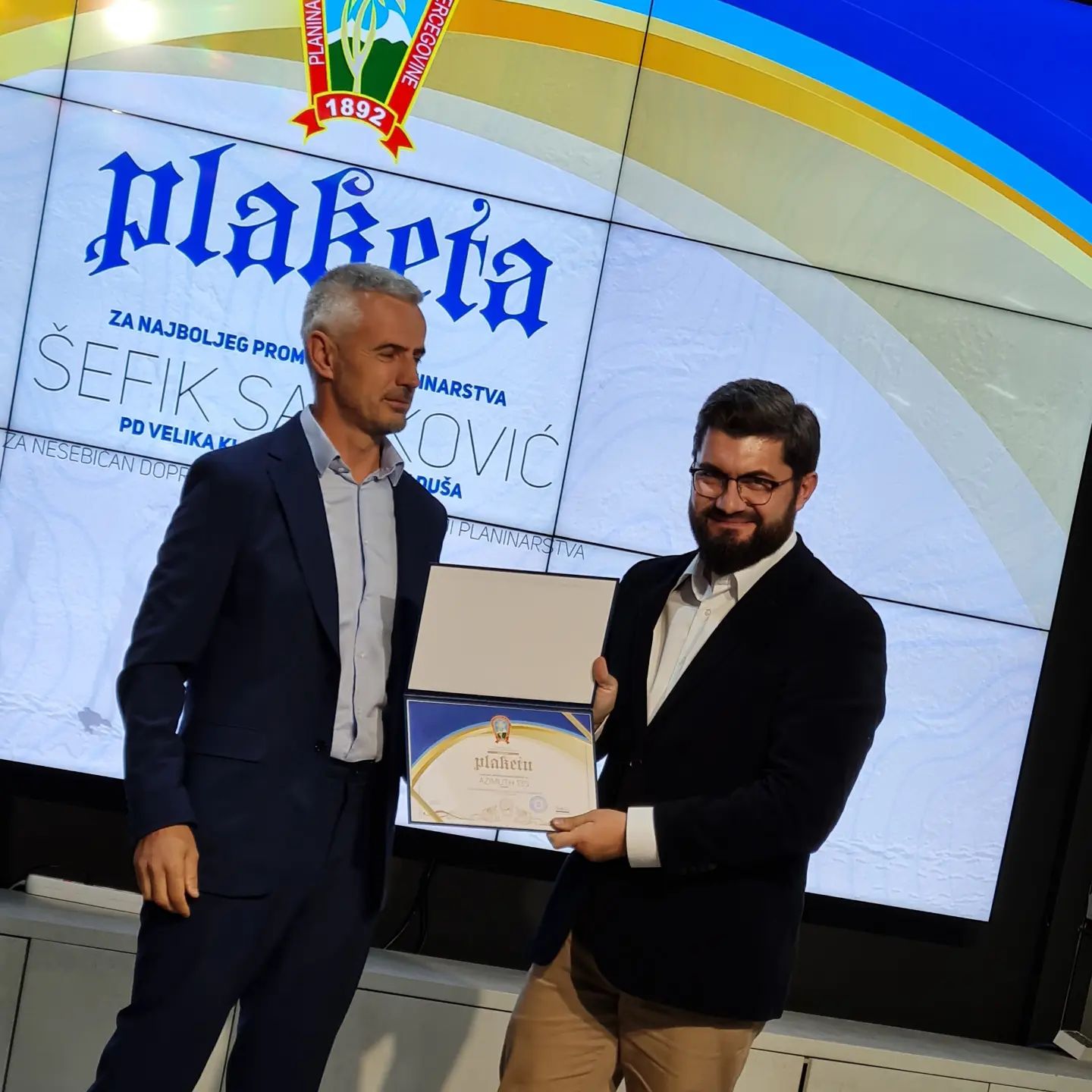 Na sinoćnjoj svečanoj akademiji u Olimpijskoj dvorani Zetra-Juan Antonio Samaranch u Sarajevu, organizovanoj povodom obilježavanja 130 godina organizovanog planinarenja u Bosni i Hercegovini, Planinarski savez Federacije Bosne i Hercegovine našem udruženju dodijelio je Plaketu za najboljeg promotora planinarstva u Bosni i Hercegovini, koju je, iz ruku člana Upravnog odbora Saveza, Ibrahima Kovačevića, primio predsjednik udruženja, Afan Abazović.