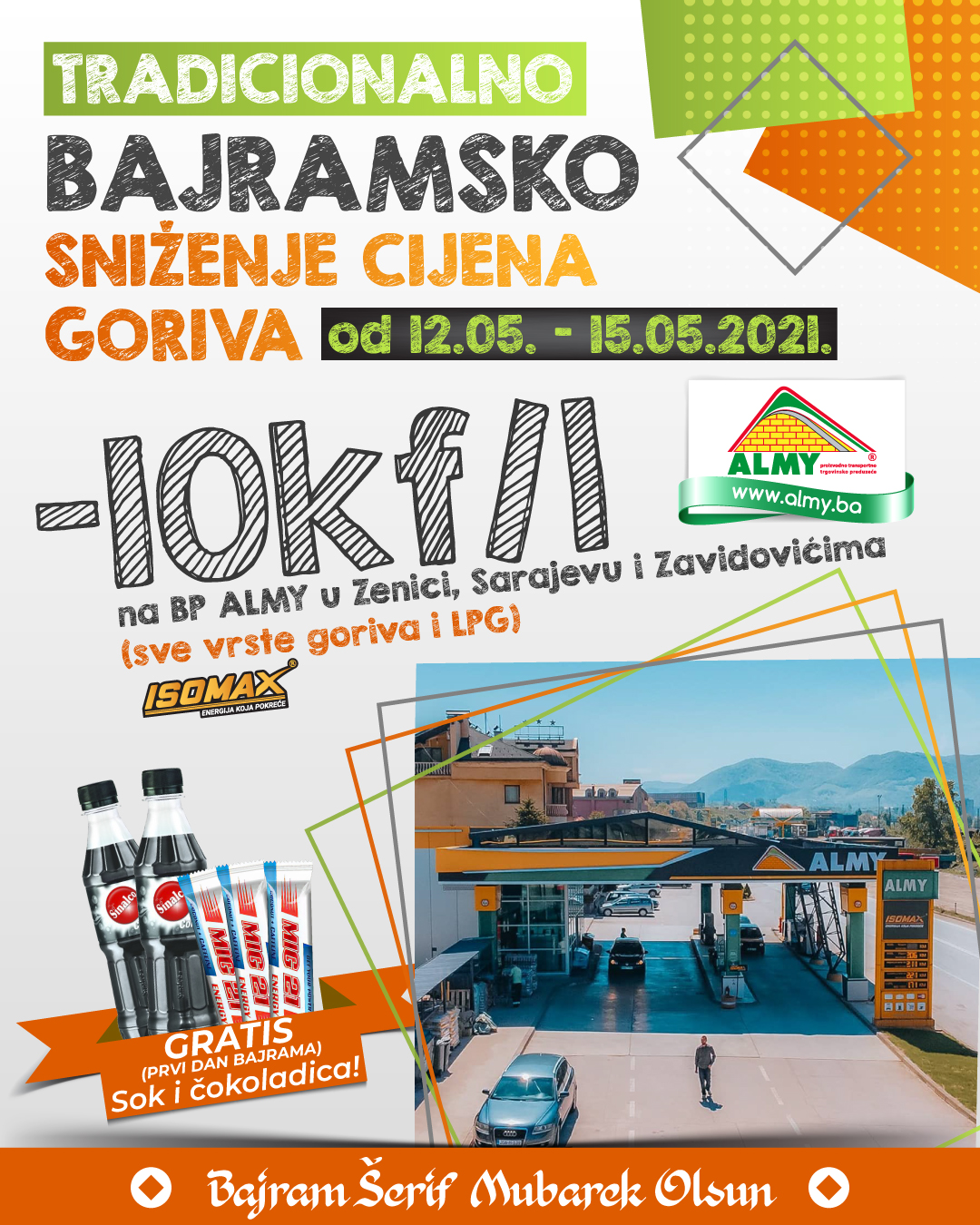 Kao i svake godine, kompanija ALMY tradicionalno dijeli radost bajrama sa svojim kupcima sniženjem goriva na benzinskim pumpama i simboličnim poklonom!