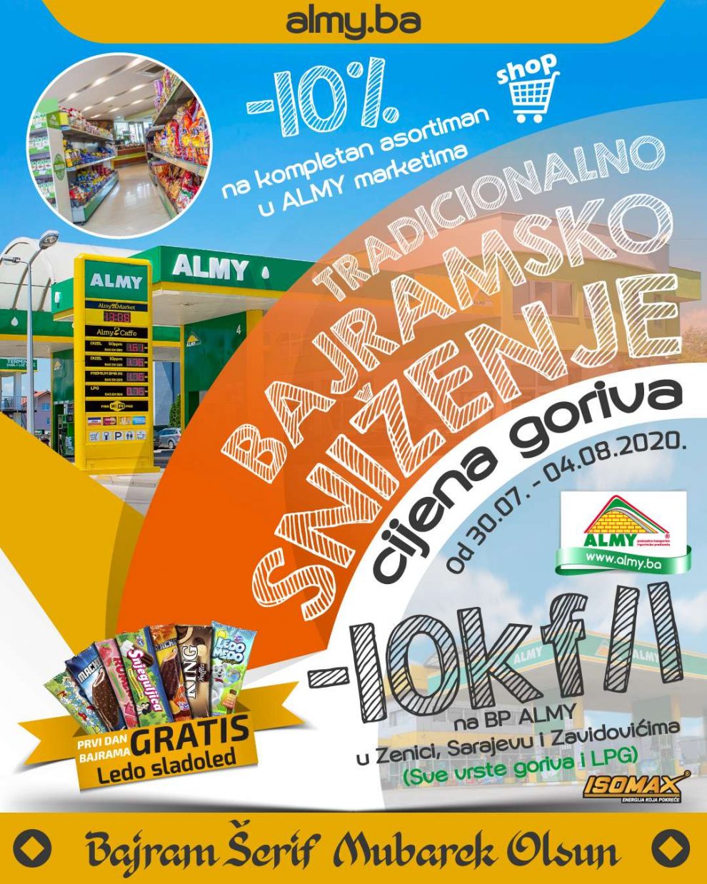 Bajramsko sniženje cijena goriva – Tradicionalno sniženje cijena goriva ISOMAX i LPG plina za -10kf/L za vrijeme Kurban bajrama i ove godine samo na benzinskim pumpama Almy u Zenici, Sarajevu i Zavidovićima.