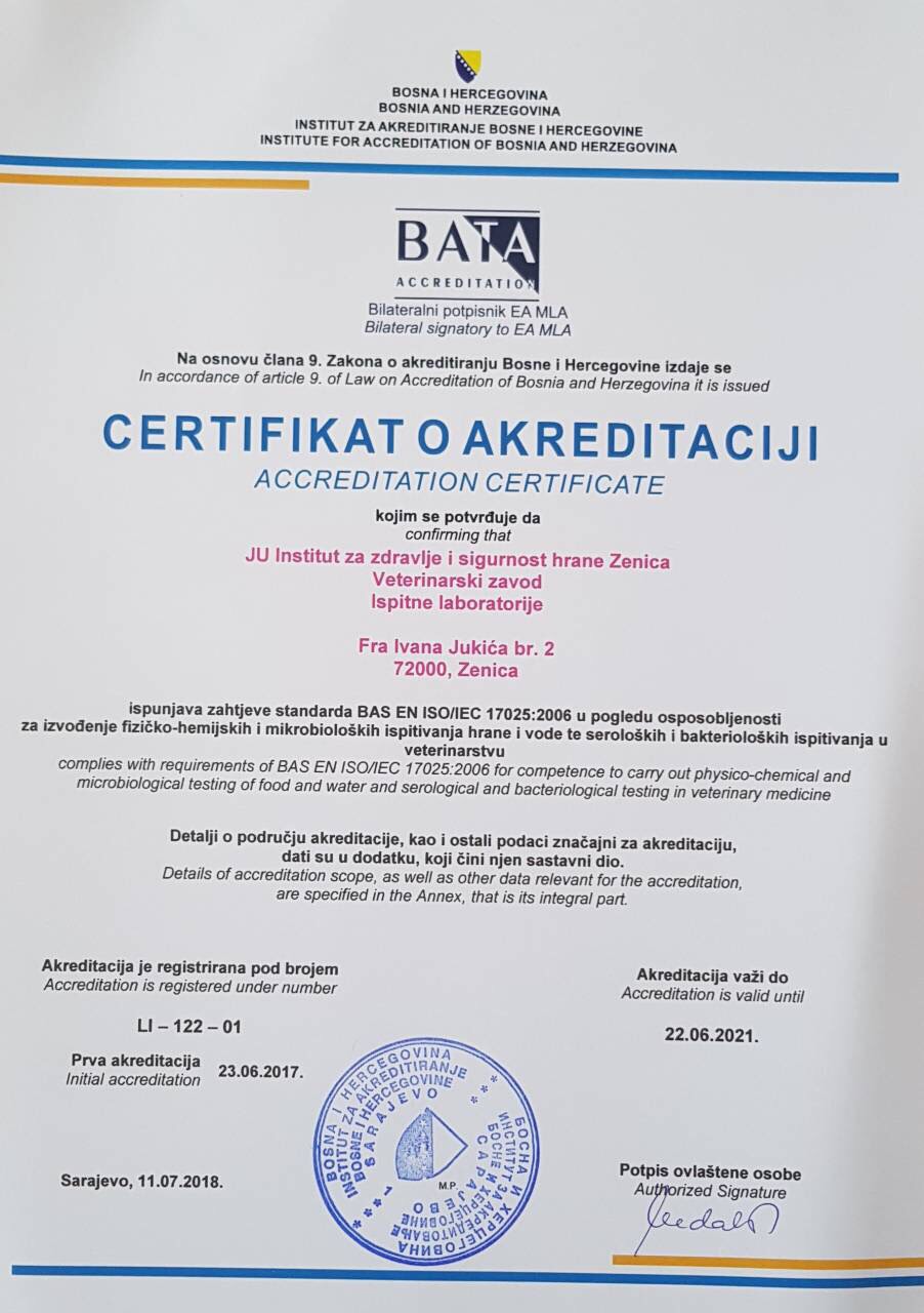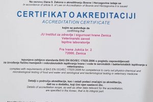 Time su ispunjeni zahtjevi BAS EN ISO/EIC 17025:2006 standarda u pogledu osposobljenosti za izvođenje fizičko-hemijskih i mikrobioloških ispitivanja hrane i vode, te seroloških i bakterioloških ispitivanja zaraznih bolesti u veterinarstvu. Time je kompletiran i objedinjen set certifikata koji su potvrda kvalitetnog i pravilnog rada u pet laboratorija INZ-a.
