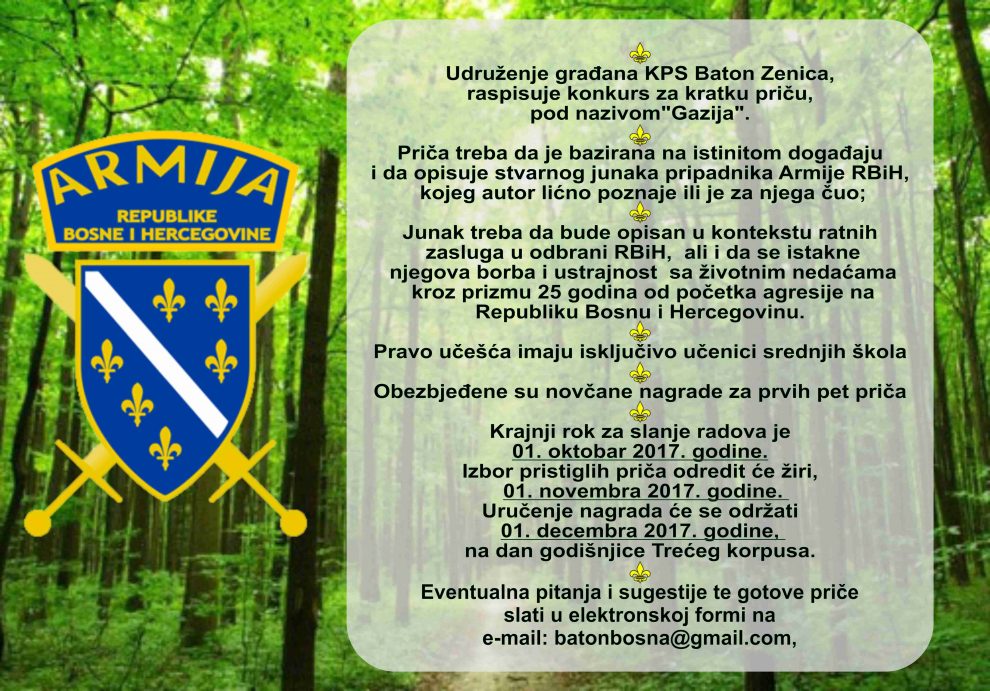 BATON Zenica raspisuje konkurs za kratku priču “Gazija” – U skladu sa statutom Udruženja i afirmacije historijskih vrijednosti Bosne i Hercegovine, Udruženje građana KPS Baton Zenica, raspisuje konkurs za kratku priču, pod nazivom „Gazija“.