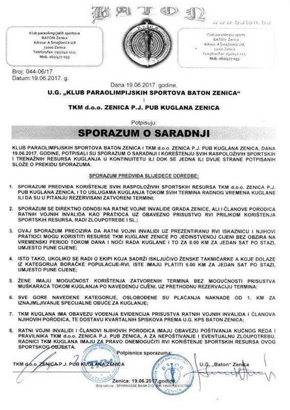 U cilju resocijalizacije ratnih vojnih invalida te konstantnom iznalaženju načina i modaliteta da se ova društvena kategorija oslobodi hendikepa i trauma u kojima se kao direktna posljedica rata nalaze, podsjećamo sve ratne vojne invalide Grada Zenice da je Udruženje građana „Klub paraolimpijskih sportova „Baton“ Zenica i TKM KUGLANA ZENICA dana 19.06.2017. godine, potpisali Sporazum o saradnji.