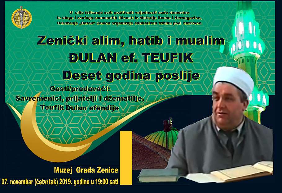 Batonovi muhabeti: ĐULAN ef.TEUFIK – Deset godina poslije – U  cilju isticanja svih pozitivnih vrijednosti naše domovine te uloge i značaja znamenitih ličnosti iz historije Bosne i Hercegovine, Udruženje „Baton“ Zenica organizuje edukativnu tribinu pod  nazivom: