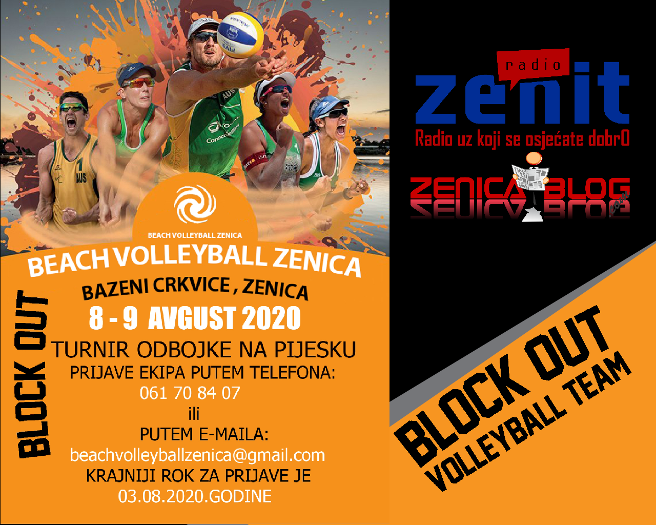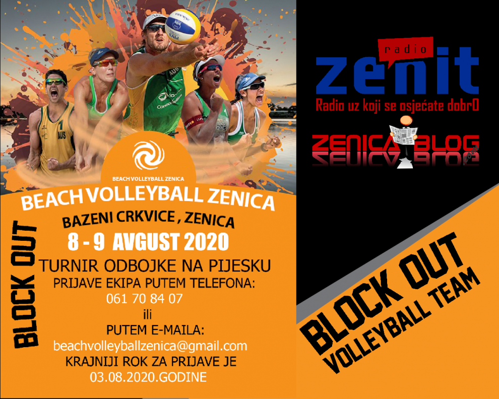Beach Volleyball Zenica – 8. i 9. august – Beach Volleyball Zenica je kompletan sportsko-zabavni spektakl u organizaciji OK BLOCK OUT Zenica koji nudi gledateljima osim vrhunskih odbojkaških mečeva na pijesku, razne sadržaje na Gradskim Bazenima Zenica koji okružuje teren kao i noćne partyje nakon mečeva. VIP zona je idealno mjesto za poslovne ljude da uz druženje u opuštenoj atmosferi steknu nova ili obnove stara poslovna poznanstva.