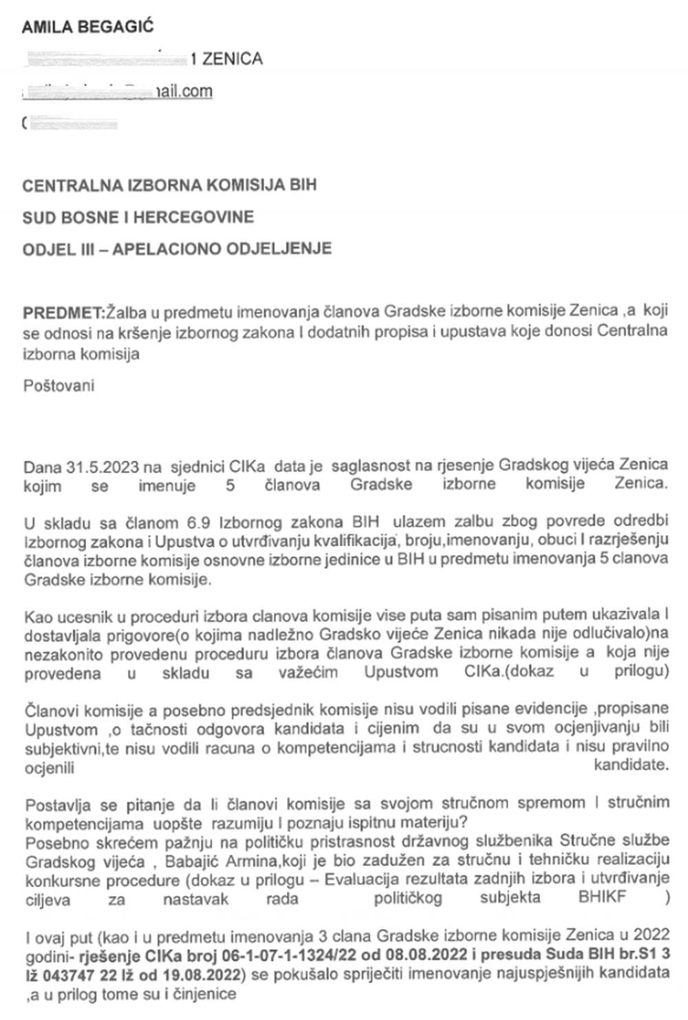 Poštovani, u kontekstu nedavno donesenih izmjena Krivičnog zakona BIH kojim su predviđene teške kazne za podmićivanje i izborne prevare obraćam vam se kao učesnik u konkursnoj proceduri za izbor članice Gradske izborne komisije Zenica, stoji u pismu poslanom na adrese medija i Centralne izborne komisije, koju je poslala naša sugrađanka Amila Begagić.