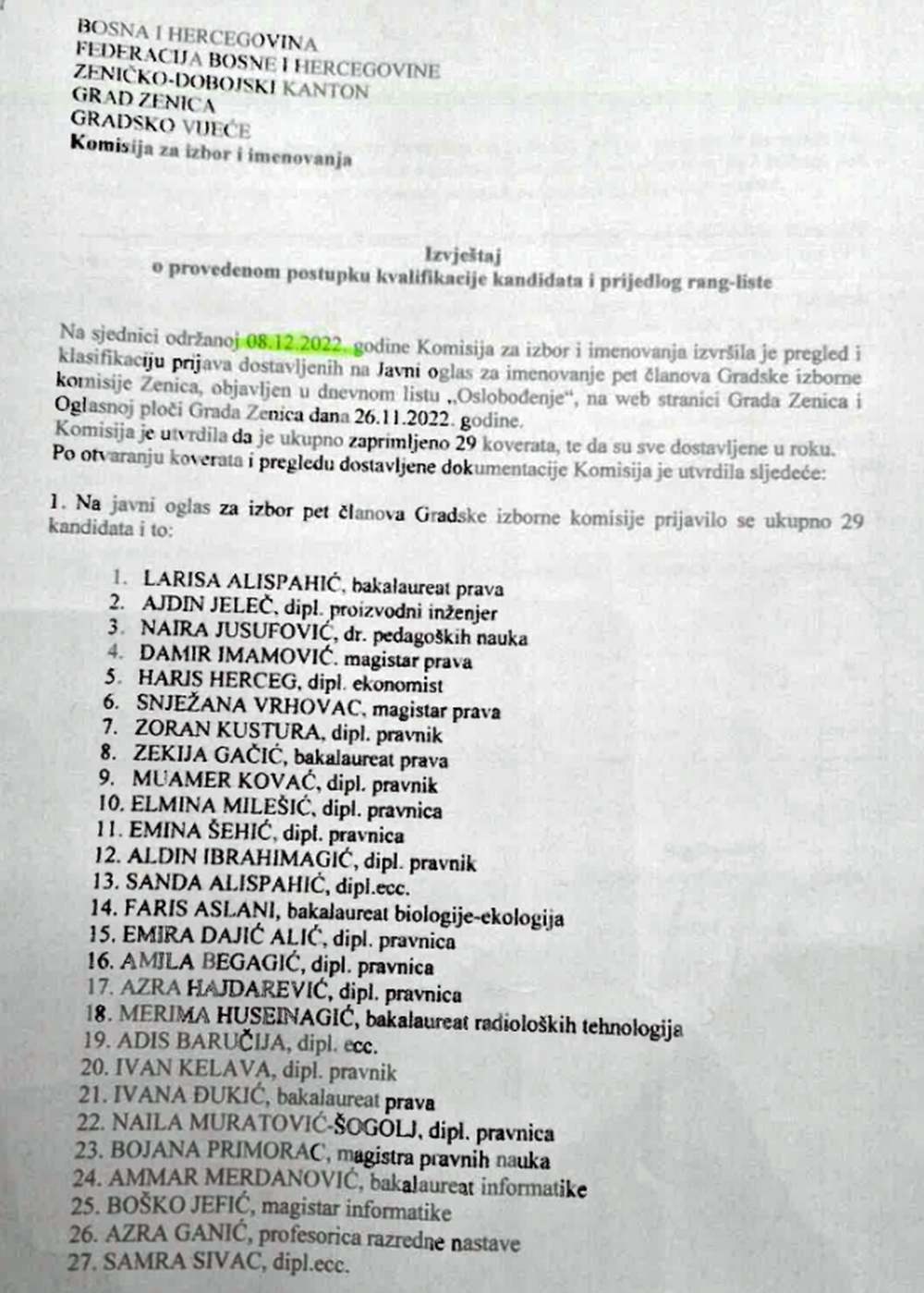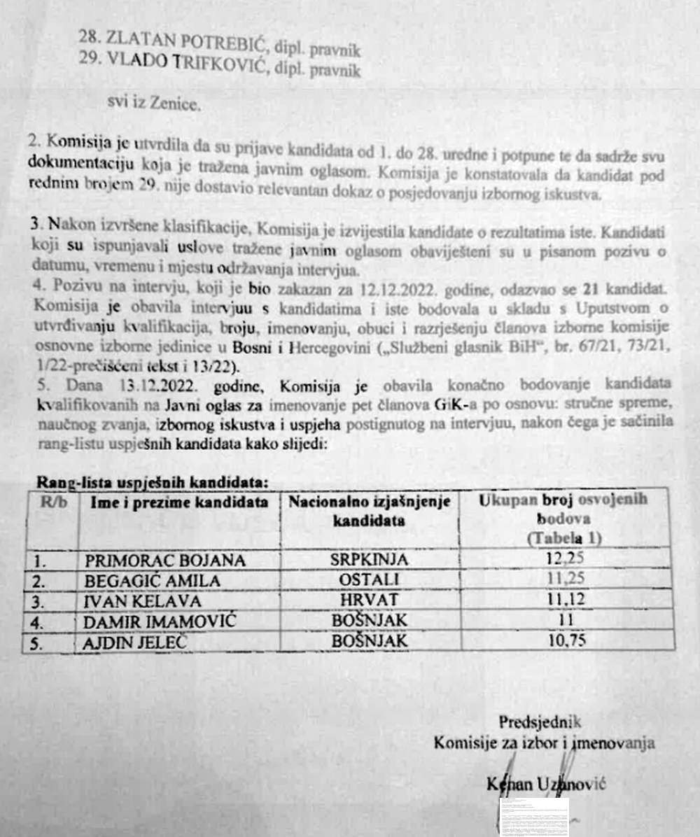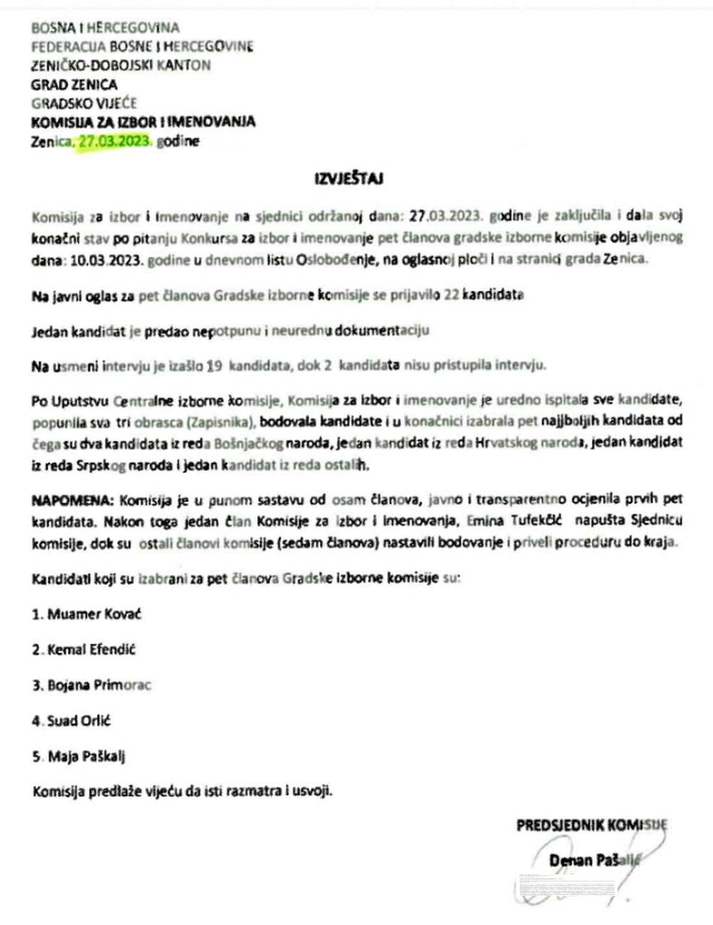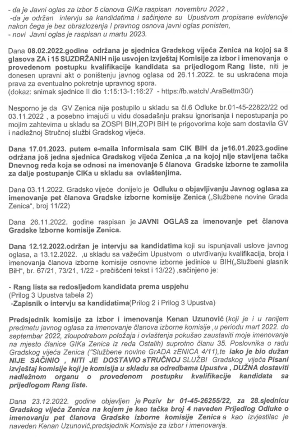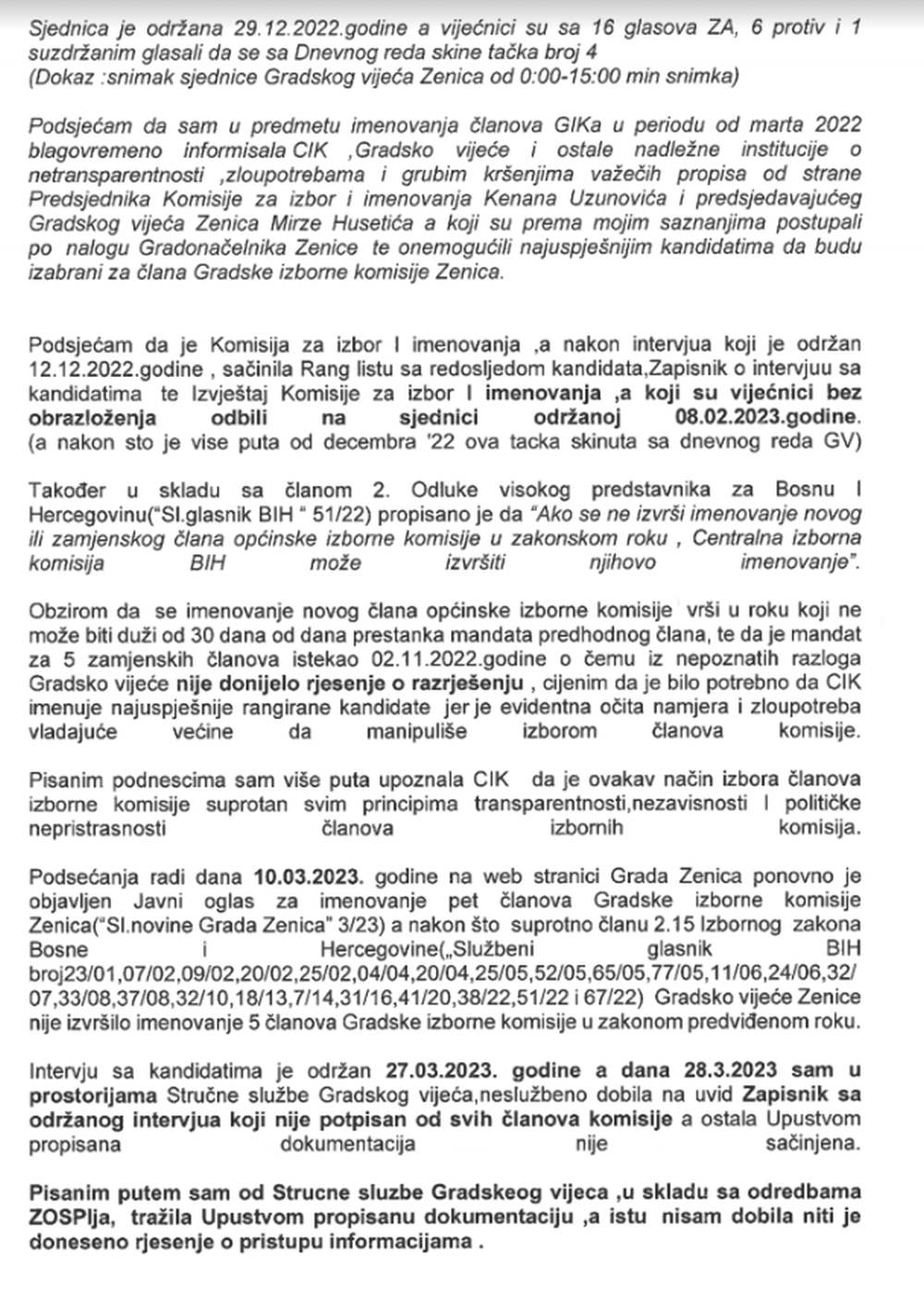Kao rezultat toga CIK BIH bez obzira na moja pisana upozorenja 31.5.2023. godine dalo je saglasnost za imenovanje 5 članova izborne komisije Zenica od kojih su 4 člana uposlenici Gradske uprave i JP iz nadležnosti Grada Zenica.(od toga je jedan nepravosnažno osuđen za krivično djelo zloupotreba položaja i ovlaštenja)