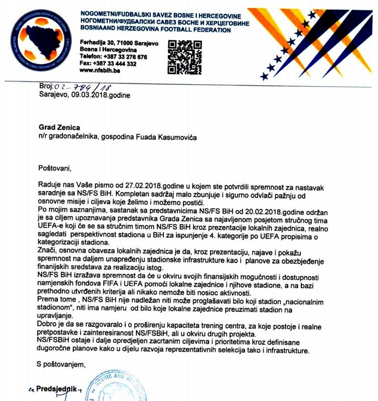 Na ovo pismo namjere odgovorio je i predsjednik Fudbalskog saveza BiH Elvedin Begić. Begić je u svom odgovru naglasio da ga raduje spremnost grada Zenica na nastavak saradnje sa krovnom kućom bh. fudbala. Međutim, Begić je upoznao Kasumovića da Fudbalski savez BiH nije nadležan da bilo koji stadion proglasi “nacionalnim stadiom”.