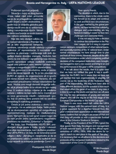 Na kraju, kao Predsjednik NS BiH, pozdravljam drage goste iz Italije, igrače i rukovodstva obje reprezentacije, kao i službene predstavnike UEFA/FIFA-e. Uz želju da se večerašnji susret odigra u duhu fair-playa, neophodno je da se svi pridržavamo odluka i protokola nadležnih institucija vezanih za suzbijanje pandemije Covid 19“, poručio je Begić.