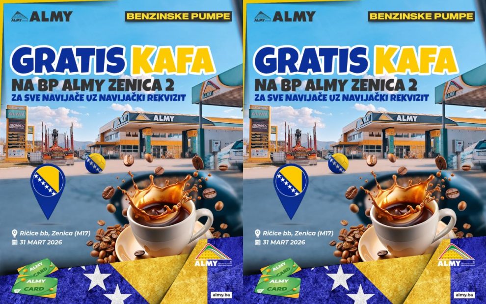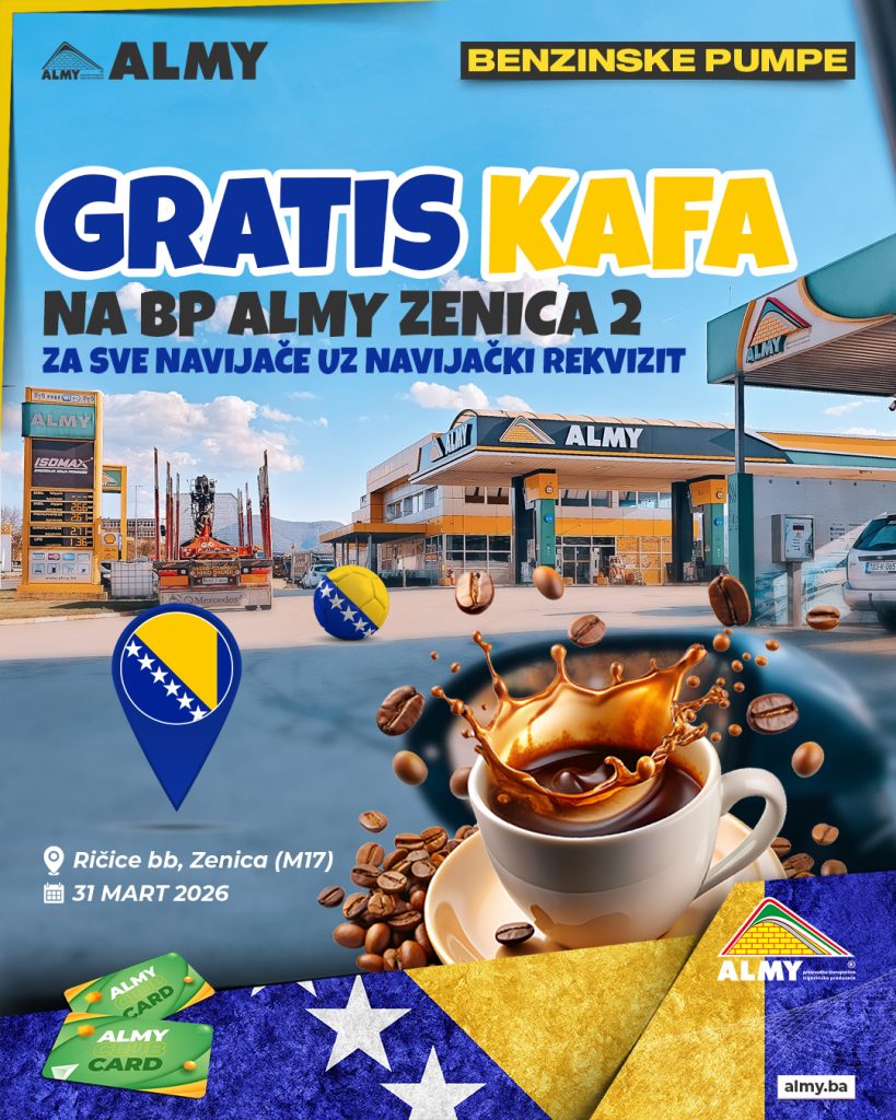 Kompanija ALMY pozvala je sve navijače reprezentacije Bosne i Hercegovine da im se pridruže na benzinskoj pumpi ALMY Zenica 2, gdje će uoči večerašnje utakmice biti organizirana podjela besplatne kafe.
