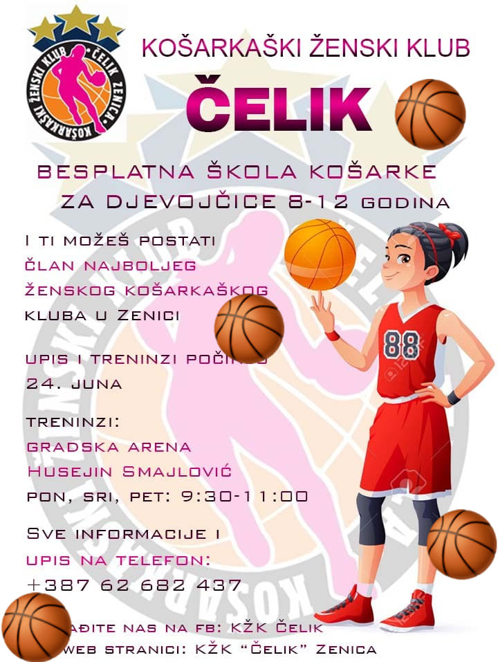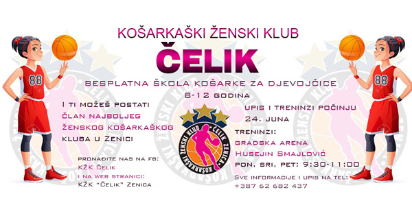 Besplatna škola košarke za djevojčice u KŽK Čelik Zenica – Košarkaški ženski klub (KŽK) Čelik iz Zenice organizuje besplatnu Školu košarke za djevojčice od 8 do 12 godina. Upis i treninzi počinju 24.juna 2019.godine. Treninzi će se održavati u gradskoj Areni „Husejin Smajlović“ u Zenici i to ponedjeljkom, srijedom i petkom od 9,30 do 11 sati.