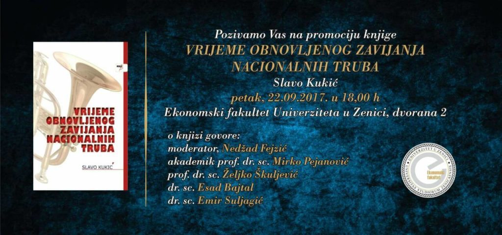 U prepunoj sali Akademije nauka i umjetnosti Bosne i Hercegovine u Sarajevu nedavno je promovisana nova knjiga profesora i bh. akademika Slave Kukića “Vrijeme obnovljenog zavijanja nacionalnih truba”. O novom djelu akademika Kukića u Zenici će govoriti ugledni univerzitetski profesori Željko Škuljević, Esad Bajtal, Emir Suljagić, kao i bh akademik Mirko Pejanović. Moderator promocije bit će Nedžad Fejzić.
