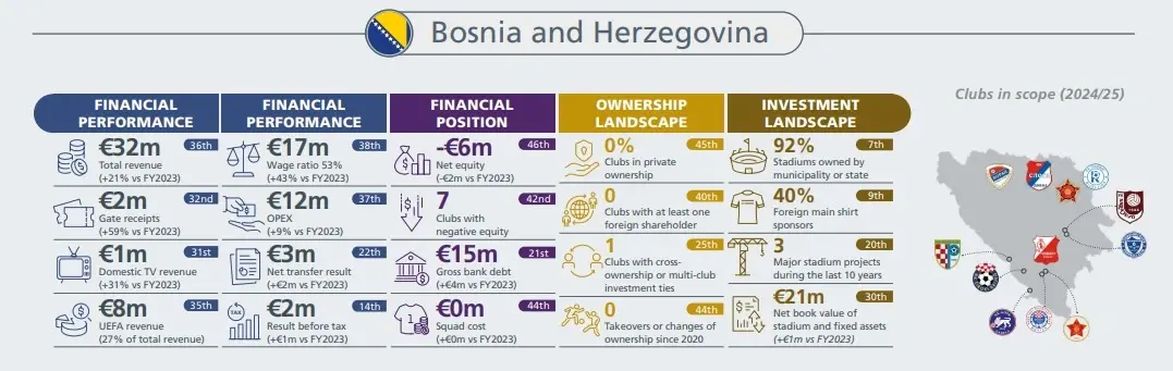 BiH ostaje specifična po tome što u ligi praktično nema privatnog vlasništva nad klubovima (0 posto), koji i dalje funkcionišu kao udruženja građana. To se odražava i na infrastrukturu, a podaci kažu da je 92 posto stadiona u vlasništvu države ili lokalnih nivoa vlasti.