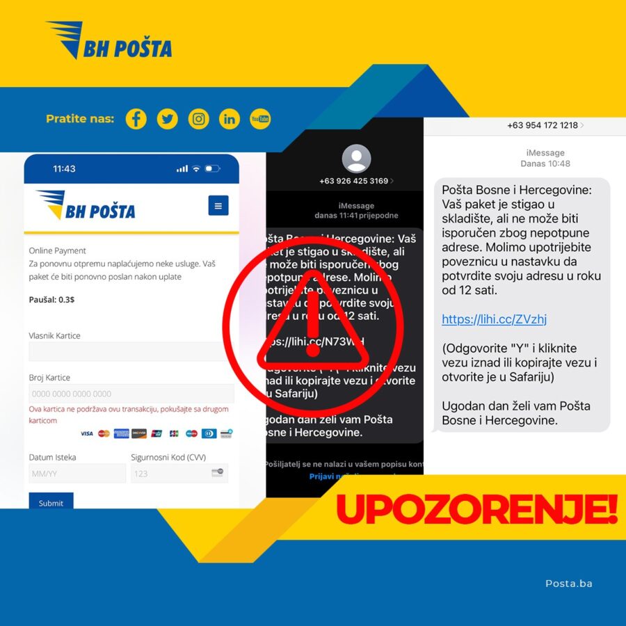 “BH Pošta je, kao poštanski operater, zajedno sa bankama i e-shop platformama u samom vrhu liste najranjivijih pravnih subjekata u smislu zloupotrebe imena i loga sa ciljem obmane i pridobijanja podataka njihovih korisnika. Svjesni potencijalnog rizika, prijetnju smo identificirali u ranoj fazi i promptno poduzeli aktivnosti na ograničavanju i ublažavanju potencijalne štete za građane i kompaniju”, naveli su.
