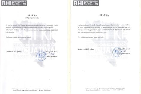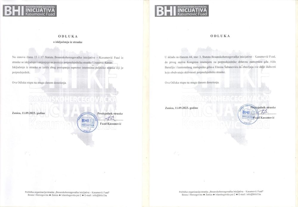 Shodno odluci Predsjednika stranke Bosanskohercegovačka inicijativa -Kasumović Fuad(BHI – KF), a u skladu sa Statutom stranke, smjenjuje se sa pozicije potpredsjednika stranke BHI – KF Uzunović Kenan, a do prvog saziva Kongresa za potpredsjednike imenuju se državna zastupnica Baručija Aida i kantonalni zastupnik Šabanović Elmin da obavljaju sve dalje dužnosti koje obuhvataju aktivnosti potpredsjednika stranke, objavljeno je iz ove partije.