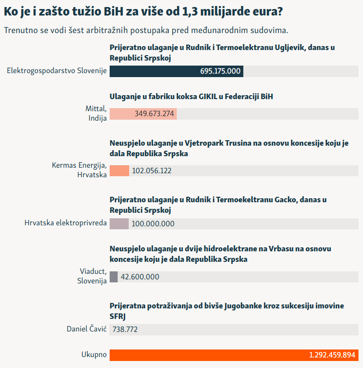 Bosna i Hercegovina je zbog kršenja ugovora između njenih entiteta i stranih investitora trenutno upletena u šest međunarodnih arbitražnih sporova koji bi mogli koštati njezine građane blizu 1,3 milijarde eura – bez kamata.