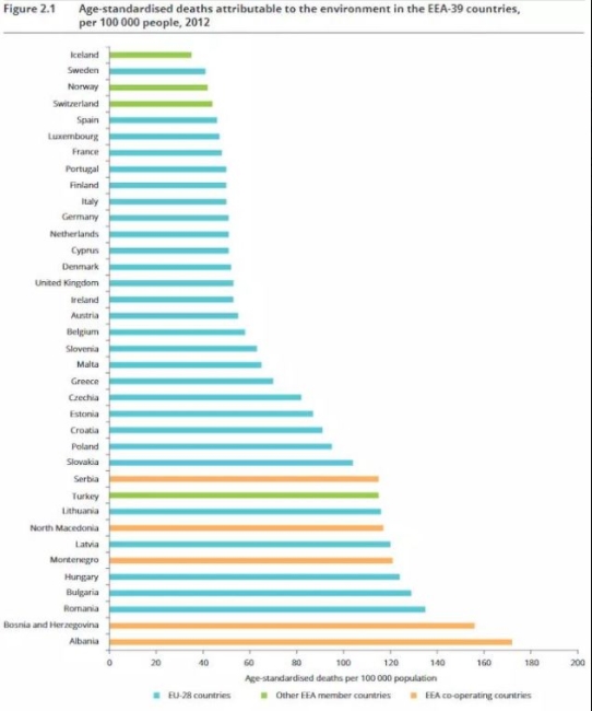 Ove zabrinjavajuće podatke objavila je Evropska agencija za okoliš (EEA) u svom izvještaju iz 2019. godine “Zdraviji okoliš, zdraviji životi: kako okoliš utječe na zdravlje i blagostanje u Evropi (Healthy environment, healthy lives: how the environment influences health and well-being in Europe)”. U izvještaju je navedeno da je smrt jedne od osam osoba povezana sa zagađenošću okoliša. Od ukupnog broja preminulih osoba na Starom kontinentu, kod 13 posto dominantni uzroci smrti su zagađen zrak i visoke temperature usljed klimatskih promjena.