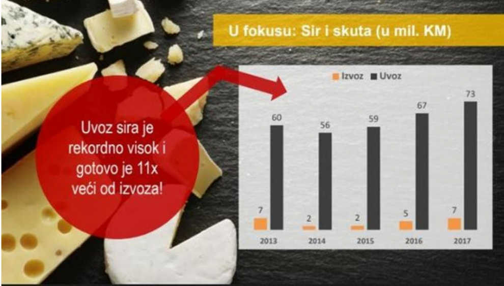 Po analizama Vanjskotrgovinske komore BiH i USAID/Sweden FARMA II projekta, u 2017. izvoz mlijeka i mliječnih proizvoda dostigao je 76 miliona KM, što je za 12 posto (8,2 miliona KM) više u odnosu na prethodnu godinu. Ipak, istovremeno je u sličnom iznosu porastao i uvoz i sada iznosi oko 142 miliona KM, tako da deficit ostaje nepromijenjen.