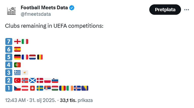 Španija ima šest preostalih klubova u Evropi, dok su na vrhu Engleska i Italija sa po sedam.