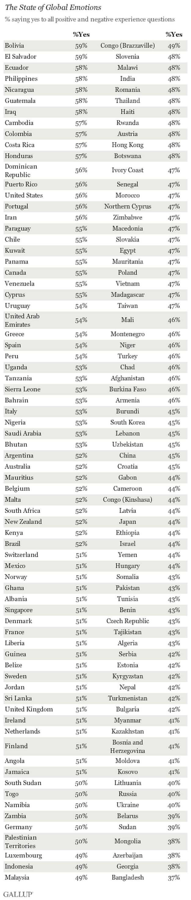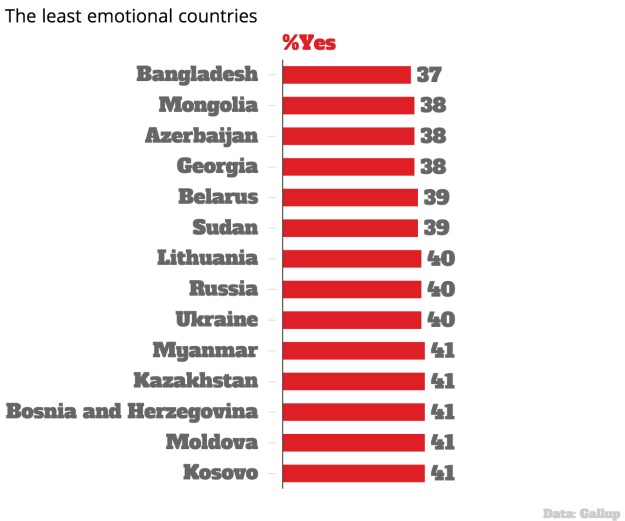Potom su gledali koliko je ispitanika iz svake države odgovorilo potvrdno na sva pitanja, pokazujući time širok raspon emocija. Najviše potvrdnih odgovora imali su ljudi iz Bolivije i El Salvadora (59 posto), dok je najmanje njih iz Bangladeša (37 posto).