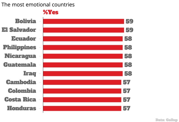 Na osnovu ovog istraživanja među najemotivnijim su zemljama na svijetu su zemlje Sjeverne i Južne Amerike.