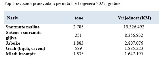 Među proizvodima koje najviše izvozimo dominiraju smrznute maline kojih je za pola godine izvezeno 2.785 tona u vrijednosti od 19,3 miliona KM.