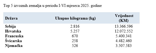 Najviše ovih proizvoda izvezeno je u Srbiju u to u vrijednosti od 13,3 miliona, zatim u Hrvatsku (12 miliona KM), Francusku (5,4 miliona KM), Švajcarsku (4,5 miliona KM), Njemačku (3,5 miliona).