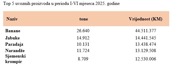 Dominantno mjesto zauzimaju banane kojih je u ovom periodu uvezeno 26.640 tona vrijednosti 44,5 miliona KM.