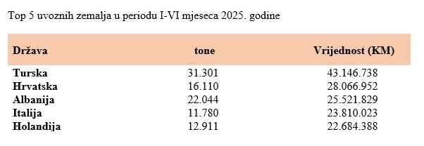 „Uvoz voća i povrća u prvih šest mjeseci 2025. godine u BiH premašio je 265 miliona KM, uz povećanje od 12,8 odsto u odnosu na isti period godinu ranije što nam govori o velikoj zavisnosti o uvoznim proizvodima. Iako BiH ima prepoznatljive izvozne proizvode poput malina, gljiva, jabuka i šljiva, izvoz ipak ostaje dosta skromniji u odnosu na uvoz“, kažu u Spoljnotrgovinskoj komori.